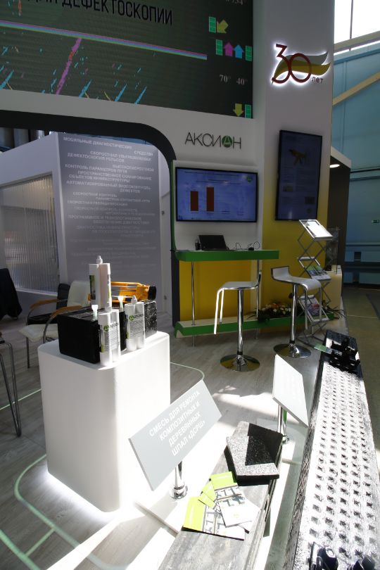 Компания АКСИОН впервые участвует в Салоне со своей продукцией – композитные железнодорожные шпалы и смесь ДСРШ, которая вызвала интерес со стороны посетителей.